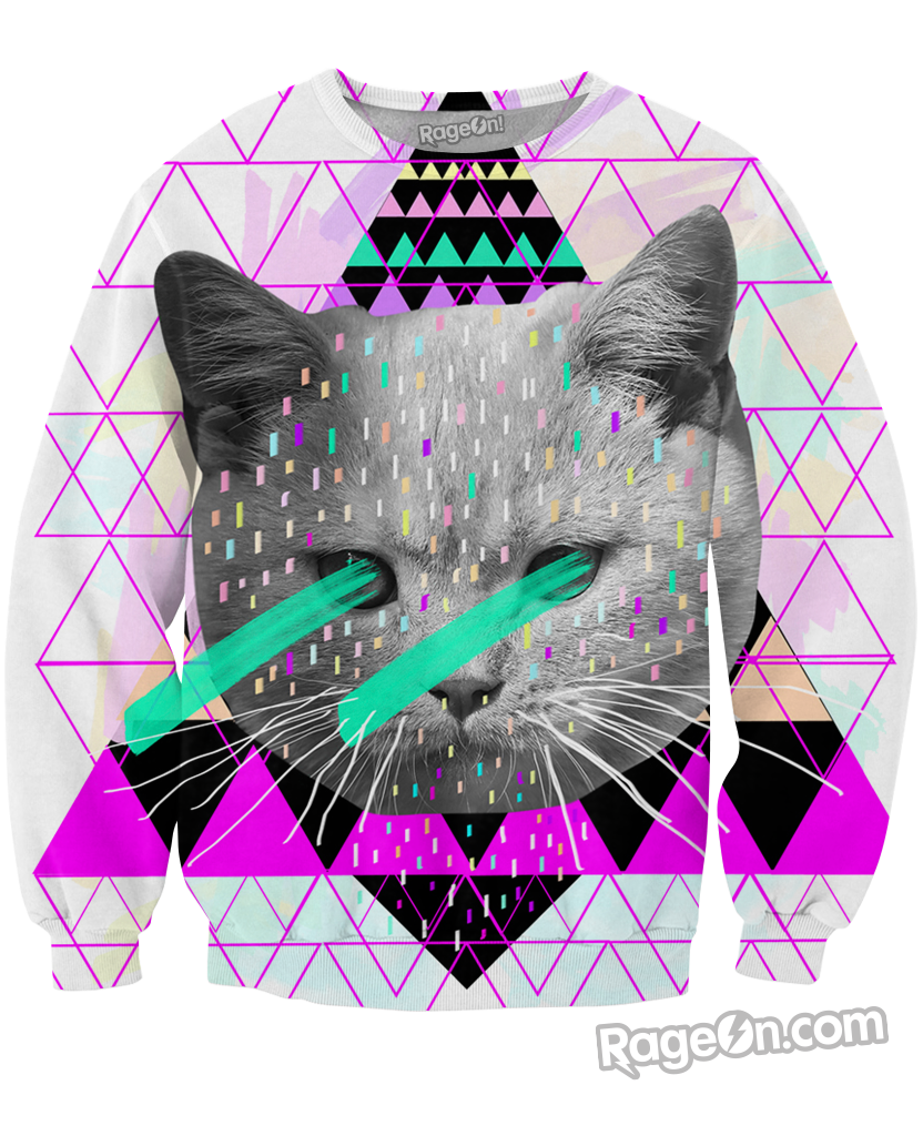Check out this Pastel Crewneck Sweatshirt from our brand by artist Kris Tate! This artistic all-over print sweater features a kitty with laser eyes covered in a vibrant native tribal print. Get this trippy fully sublimated sexy jumper today, exclusively on RageOn!